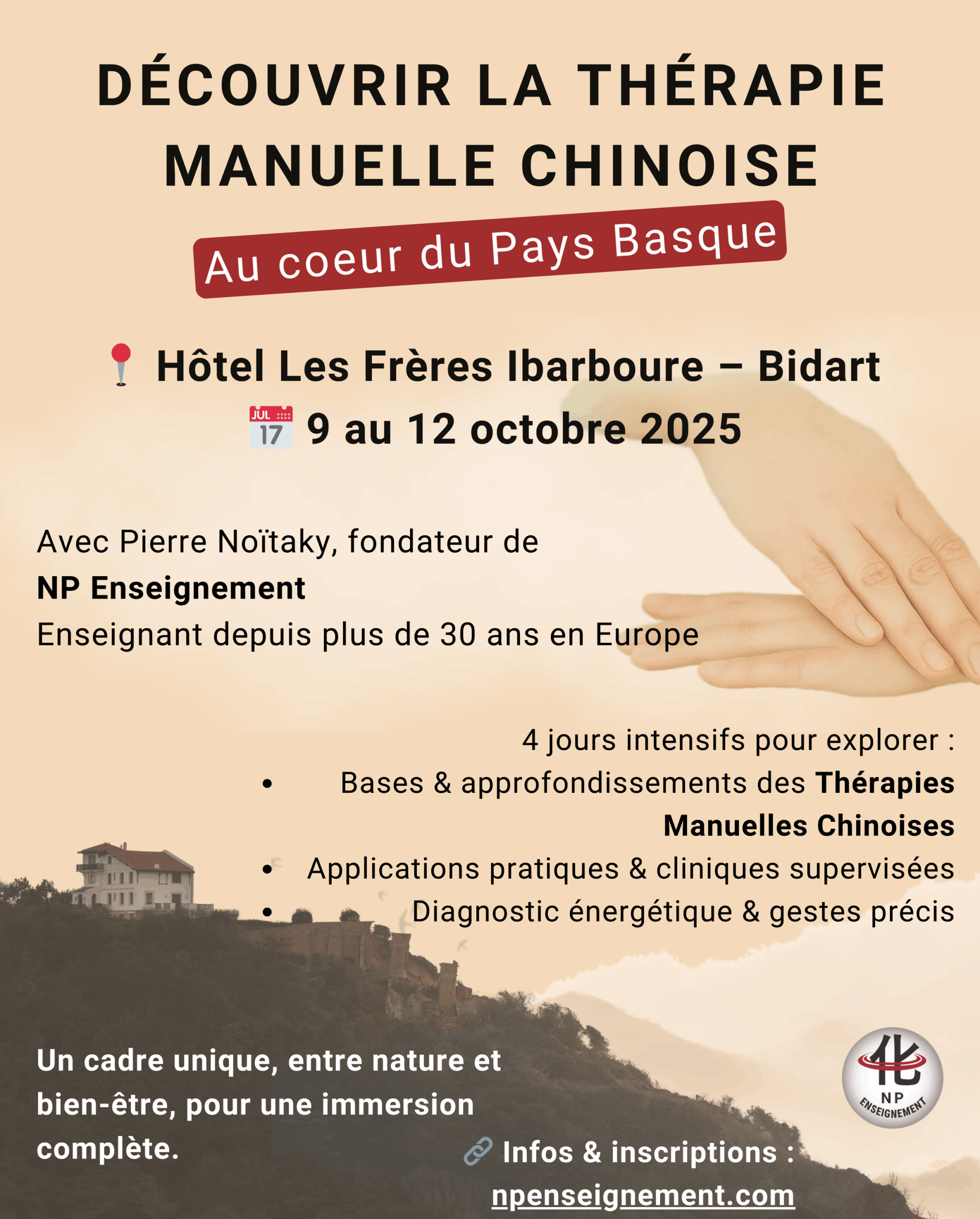 Du 9 au 12 octobre 2025, NP Enseignement propose une session exceptionnelle de thérapie manuelle chinoise à l’Hôtel Les Frères Ibarboure, à Bidart, sur la côte basque.
